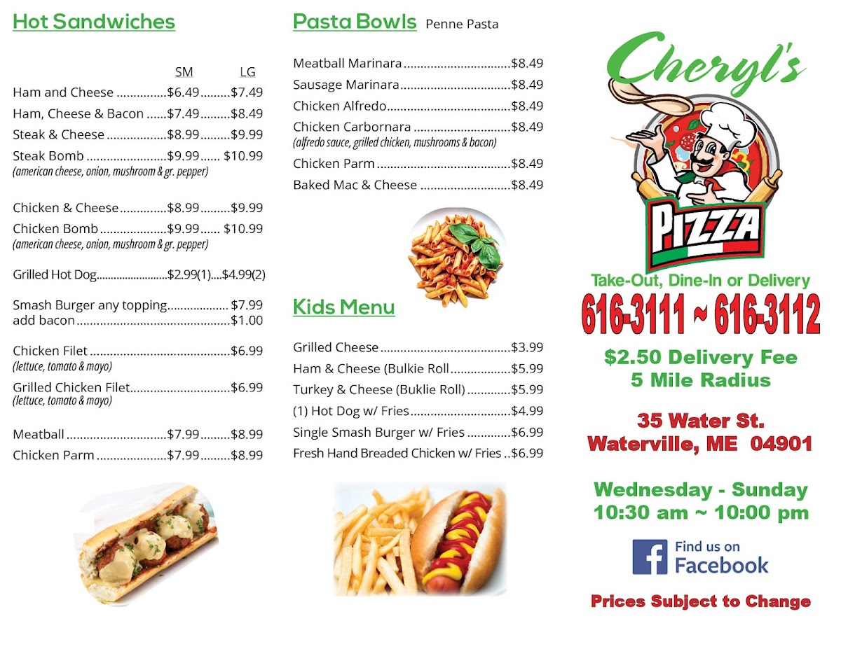 Welcome to Cheryl’s Pizza, a delightful culinary haven located at 35 Water St, Waterville, ME. This pizza joint has quickly become a local favorite, known for its exceptional selection of specialty pizzas, such as the flavorful Buffalo Chicken and hearty All Meat varieties. With prices starting at just $8.99 for a classic Cheese pizza, you can indulge without breaking the bank.